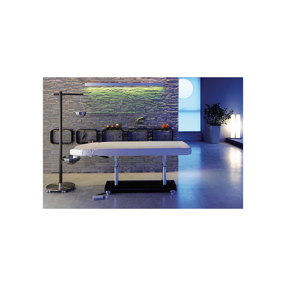Модель оснащена керамической емкостью для сбора масла и полкой для хранения аксессуаров. Возможно исполнение основания в двух вариантах – из цельного дерева и древесины с алюминиевыми вставками. В обоих случаях кушетка комплектуется бесшовным матрасом из искусственной кожи. Представлено несколько вариантов цветового исполнения.
