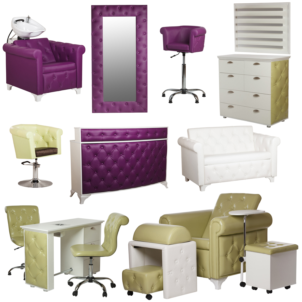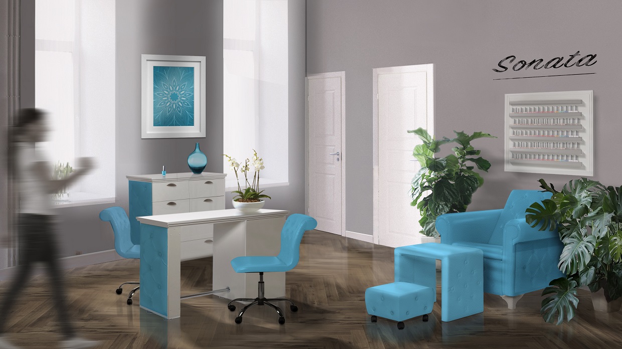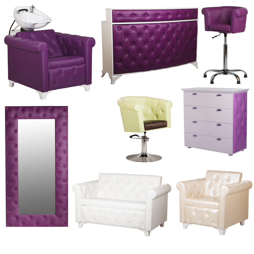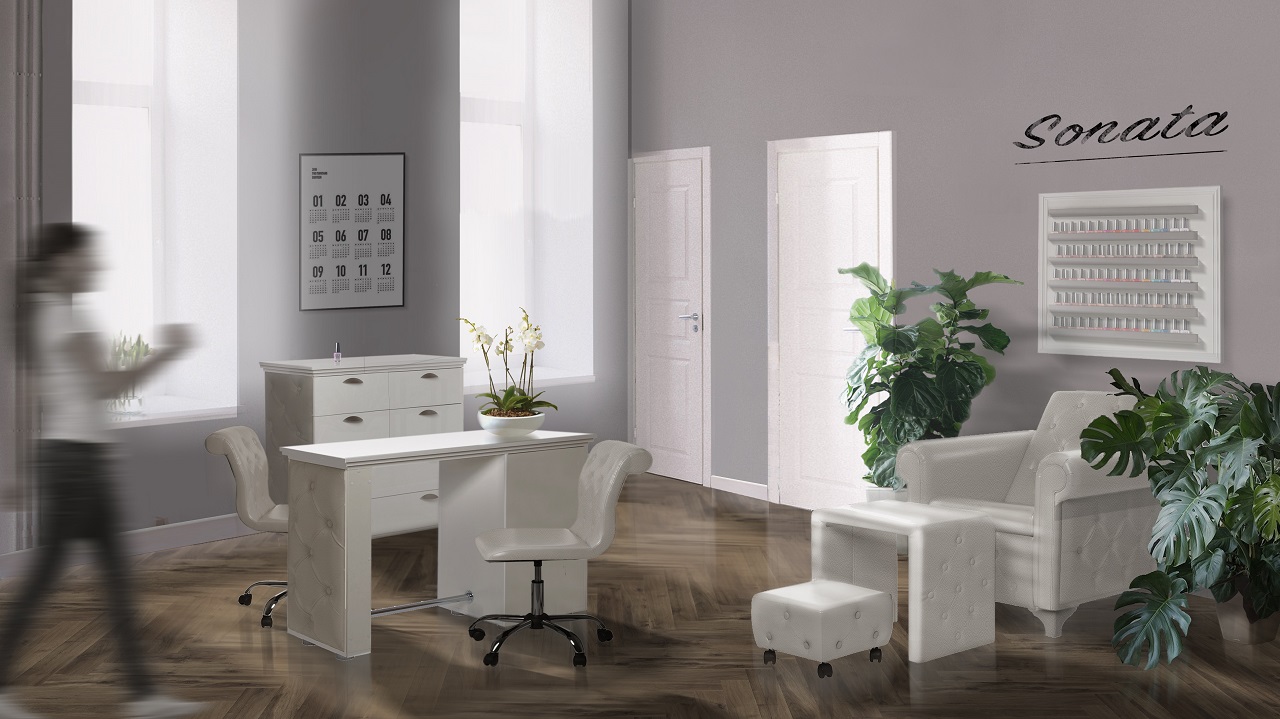 Парикмахерский комплект «Соната» включает в себя все предметы, которые необходимы для обустройства парикмахерской зоны и холла. В него входит парикмахерское кресло и детское кресло, одностороннее зеркало, парикмахерская мойка с креслом. Также в комплект входит стойка администратора, комод, диван и кресло.