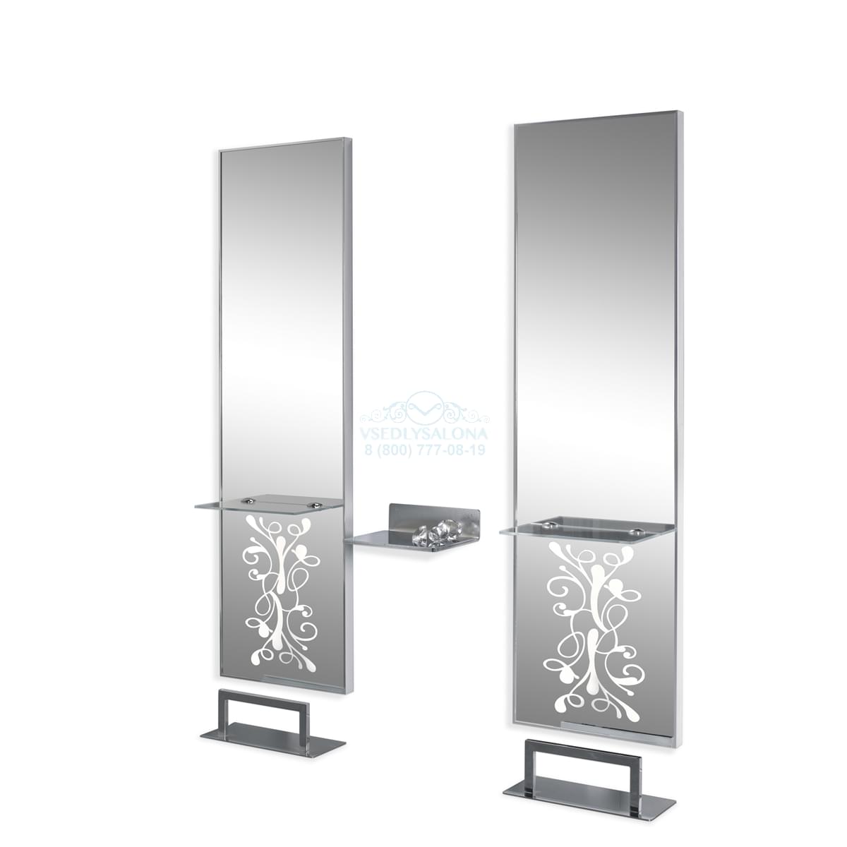 Рабочее место мастера, высокое зеркало в алюминевой раме со стеклянной полочкой и световой инкрустацией контражур в нижней части. Подножка металл.