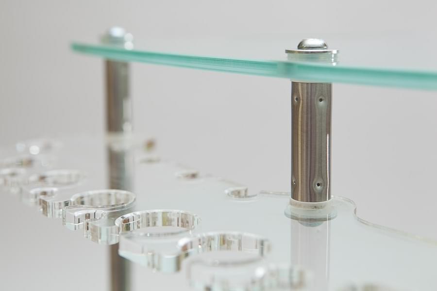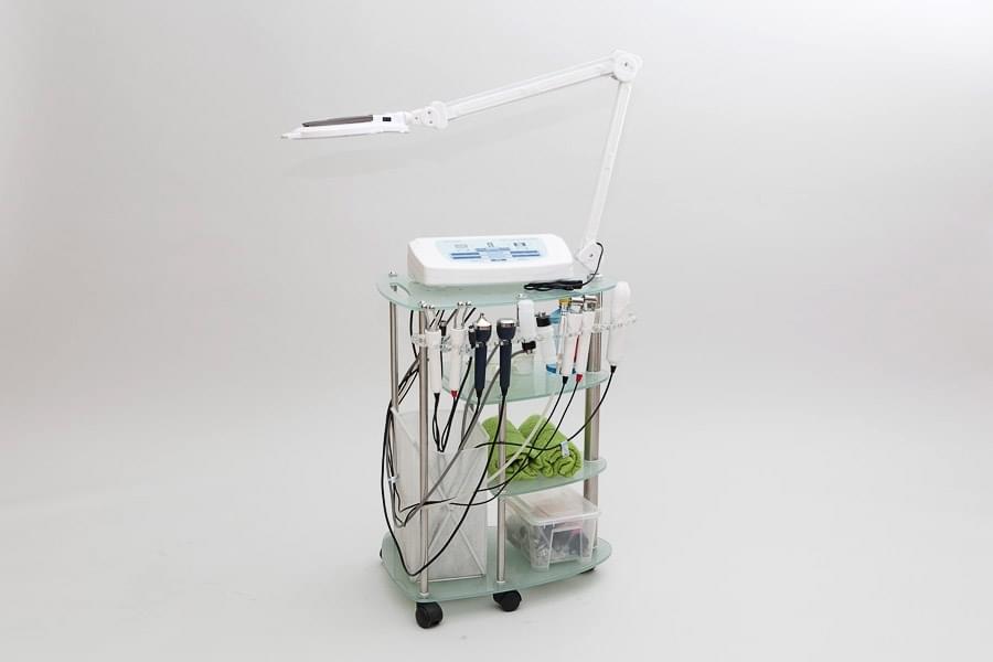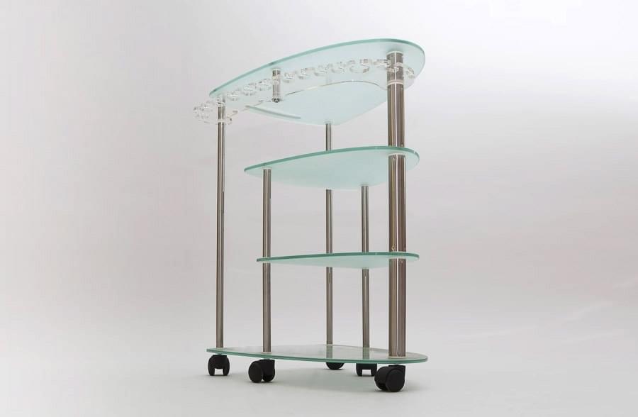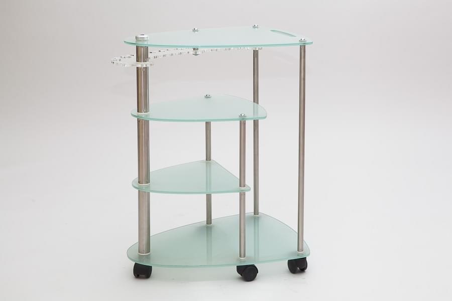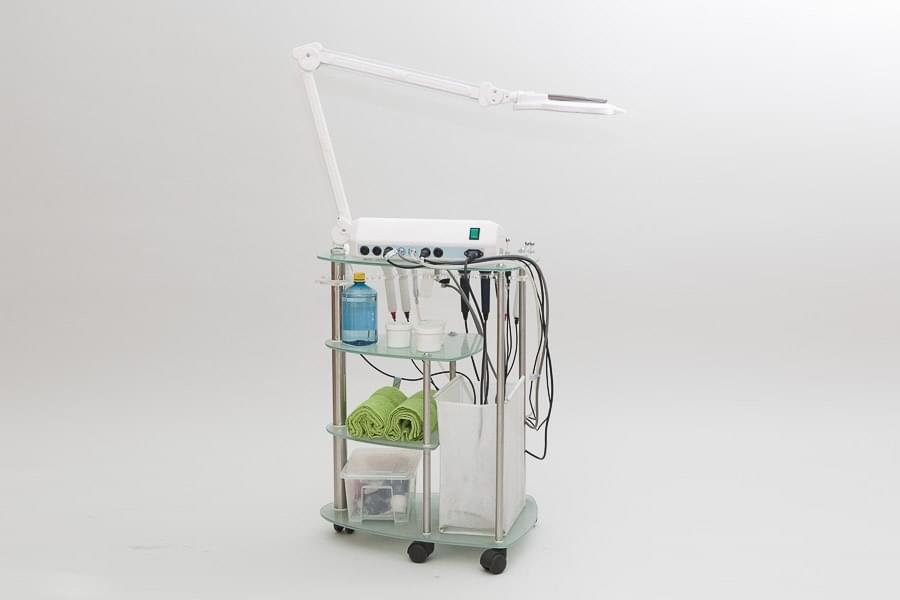 Лёгкая и многофункциональная тележка SD-977 предназначена для размещения косметологических аппаратов серии SD. Изделие представляет собой столик на стальном хромированном каркасе с четырьмя полками из прочного матового стекла. Конструкция разработана таким образом, что высота между ними позволяет устанавливать популярные и часто используемые косметологические инструменты и оборудование. Также тележка имеет специальный держатель для пилинга, дарсонваля и гальваники.