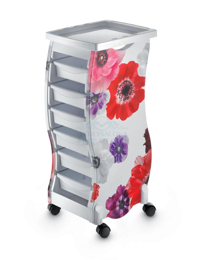 Тележка парикмахерская выполнена из пластика, на колесиках, с выдвижными ящиками. Цвет: белый с рисунками.