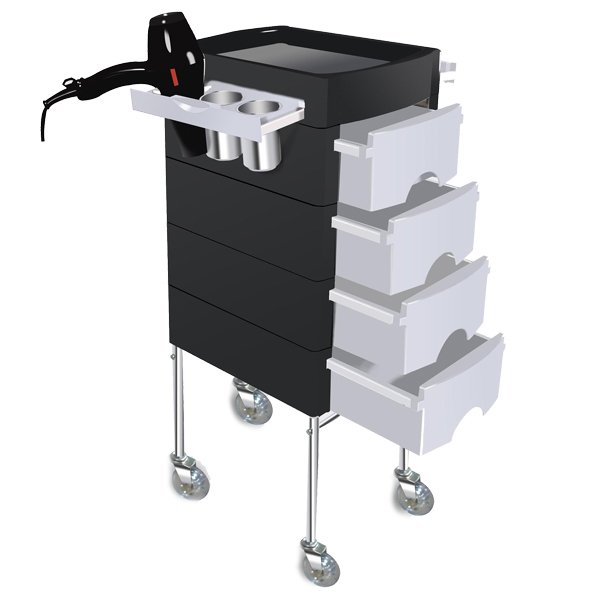 Это прекрасное приспособление в котором разместится великое множество необходимых для работы аксессуаров и инструментов. Подобный товар давно стал обязательным атрибутом любой парикмахерской или салона, ведь он отличается компактными размерами и многофункциональностью. Тележка помогает правильно организовать рабочее правильно организовать рабочее пространство и держать весь необходимый инструментарий всегда под рукой. Это изделие изготовлено на металлическом каркасе оснащенном колесной базой и 4 пластиковыми выдвижными ящиками и двумя боковыми столиками-органайзерами.